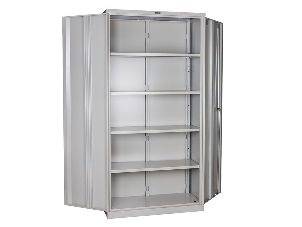 Имеет 5 уровней хранения. Внутри шкафа устанавливаются 4 полки. Максимальная нагрузка на полку - 60 кг. Оригинальная конструкция ригелей из нержавеющей стали и пластиковые втулки обеспечивают бесшумный ход дверей и надежное запирание шкафа. Комплектуется ключевым замком. Стандартный цвет - серый полуматовый (RAL 7038). Опция: окраска дверей в другие цвета из палитры производителя, +10% к стоимости (при заказе от 50 шт.)