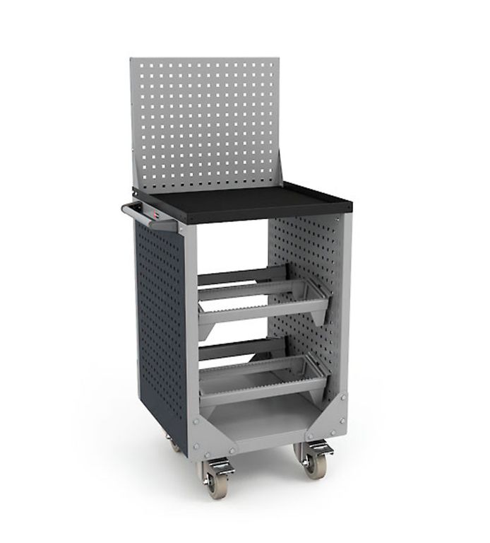 Окрашена эпоксидной порошковой краской, устойчивой к механическим воздействиям и агрессивным жидкостям. Внешние боковые экраны - антрацитово-серые RAL 7016, внутренние экраны, корпус, полка, салазки и рамы для инструмента - серые RAL 7038, Лоток – черный RAL 9005.