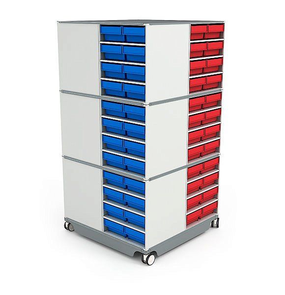 Ящики на выбор могут быть красного или синего цвета. Стенки ящиков изготовлены из пластика толщиной 3 мм. В ящики можно установить пластиковые перегородки.