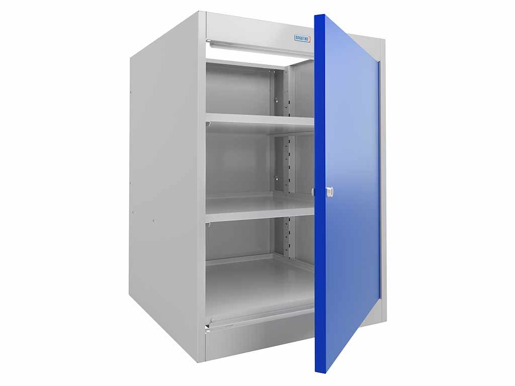 Имеет распашную дверцу, установленную на петли, открывание двери - 180°. Дверь укомплектована ключевым замком Практик, 10000 комбинаций. Внутри тумбы 2 съемные, регулируемые полки.