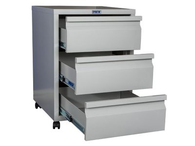Имеет 3 выдвижных ящика, которые запираются на центральный замок ПРАКТИК (2000 комбинаций). Полное выдвижение ящиков осуществляется с помощью телескопических шариковых направляющих.