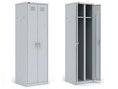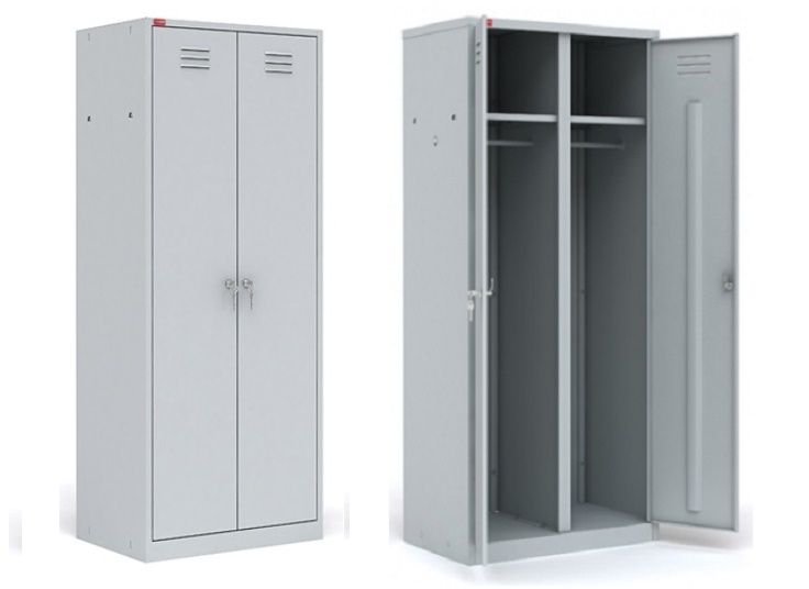 Шкаф двухсекционный, каждая секция снабжена дверью с индивидуальным врезным замком, съемной полкой для головного убора, перекладиной для вешалки, двумя крючками для одежды.