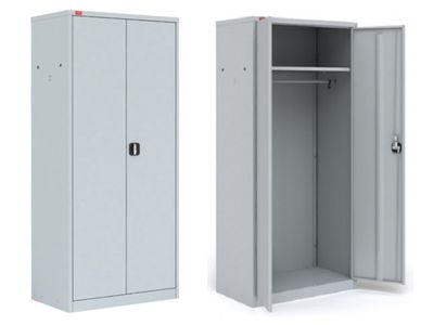 Имеет две распашные двери. Укомплектован полкой для головных уборов, перекладиной для вешалок, двумя крючками для одежды и ригельным замком повышенной секретности. Поставляется в разобраном виде.