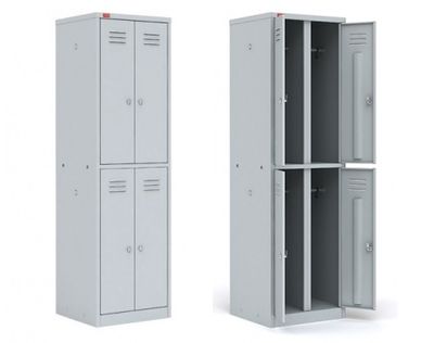 Шкаф двухсекционный с четырьмя отделениями для одежды. Каждое отделение снабжено дверью с индивидуальным врезным замком, перекладиной для вешалки и двумя крючками. Поставляется в разобраном виде.