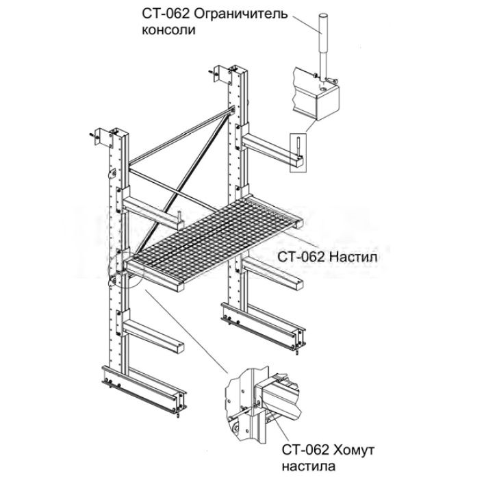 При хранении коротких грузов (менее 1,5 м) между двумя консолями в секции можно установить настил, который должен быть прикреплен к консолям хомутами. Для того, чтобы груз не скатывался, на консоль можно установить ограничитель. Настил, хомуты, ограничитель консоли приобретаются отдельно.