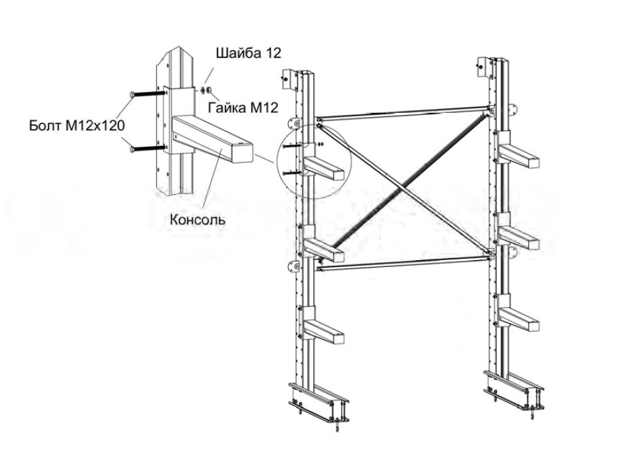 Устанавливается на стойку стеллажа при помощи двух болтов М12х120 (крепеж идет в комплекте).