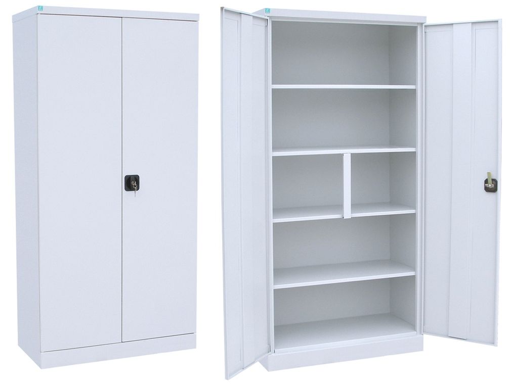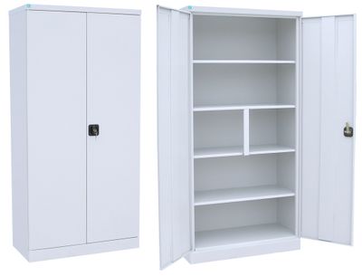Изготовлен из металла, оборудован четырьмя полками. На шкаф дополнительно можно установить антресоль.