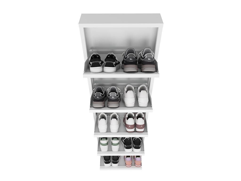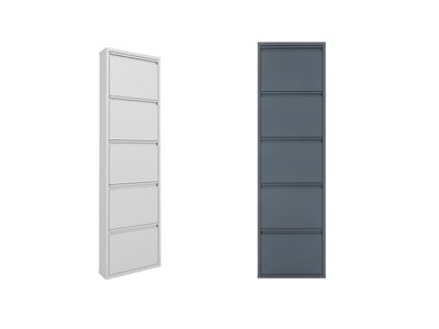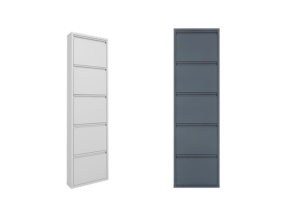 Обувница ОМ-5 имеет цельносварную конструкцию, а также пять откидных полки с возможностью одновременного открывания для хранения двух пар обуви на каждой секции до 43 размера.
