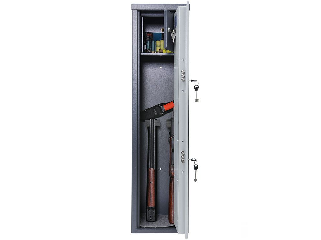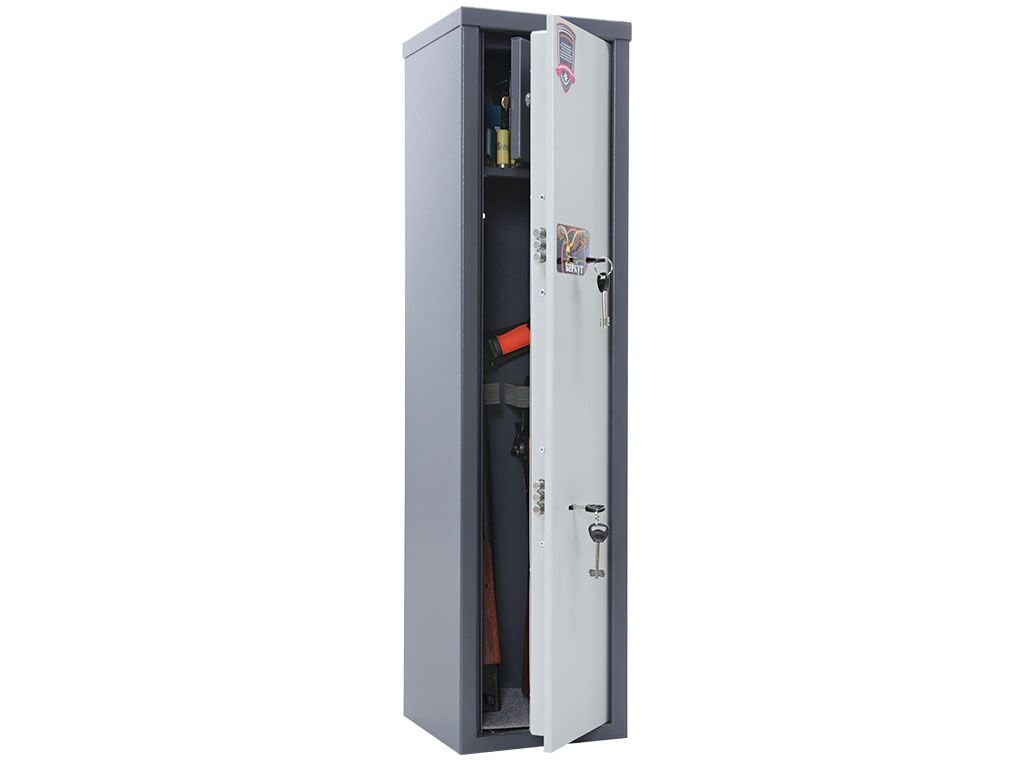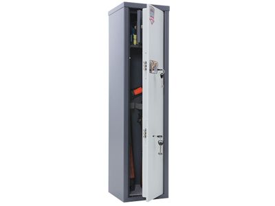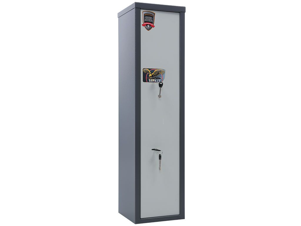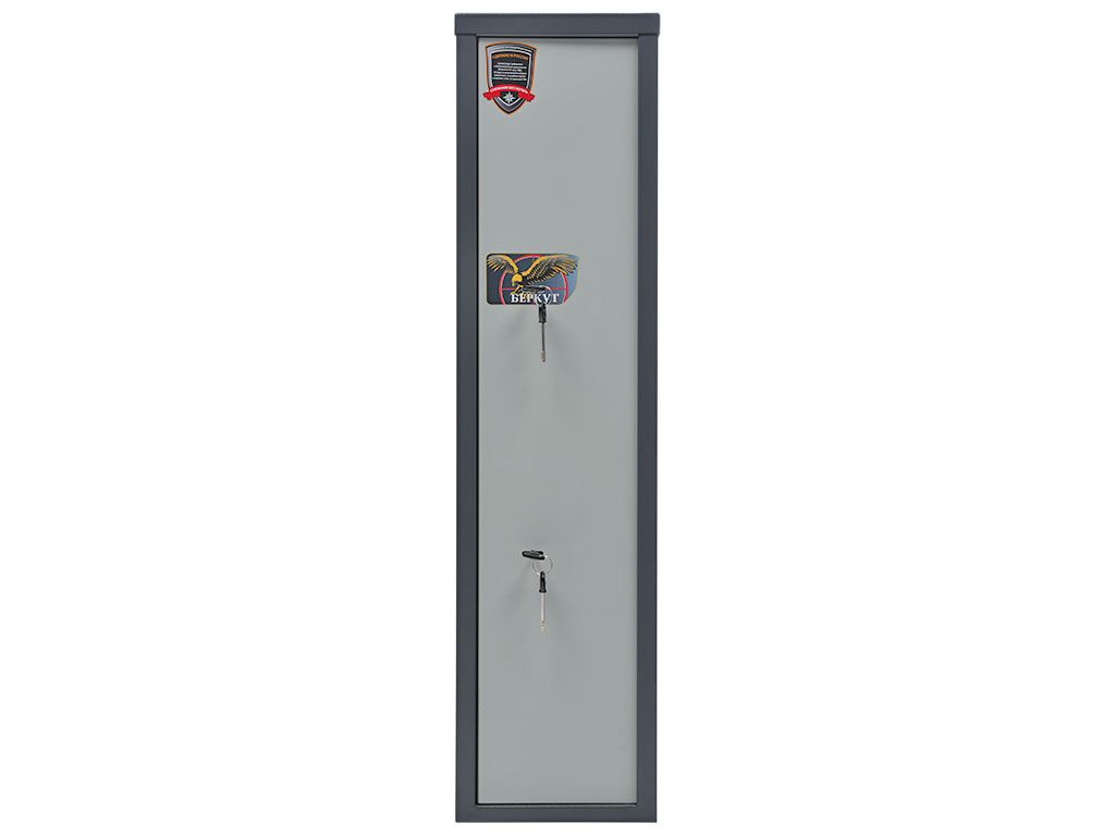 Шкаф (сейф) оружейный AIKO БЕРКУТ-1 предназначен для хранения огнестрельного оружия и соответствует требованиям ст.59 Постановления правительства РФ № 814 от 21 июля 1998 года «О мерах по регулированию гражданского и служебного оружия и патронов к нему на территории РФ». Толщина металла корпуса и двери – 2 мм. Оборудован патронным отделением (трейзером), запирающимся на ключ, полкой, ложементами для ружей, ковриком. Комплектуется двумя ключевыми замками. Максимальная высота ствола 820 мм. На задней стенке имеются отверстия для крепления шкафа к стене. Тип покрытия: порошковое. Цвет: графит структурированный (RAL 7024).