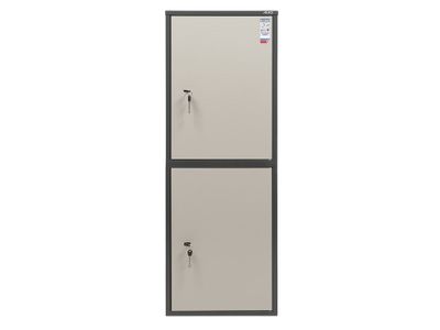 Представляет сварную конструкцию из стали, толщиной 1,2 мм. Двухсекционный, верхняя секция оборудована встроенным отделением, запирающимся на ключ. Обе секции оборудованы полками. Каждая дверь имеет закрытую внутреннюю панель. Комплектуется ключевыми замками Практик. Поставляется в собранном виде.