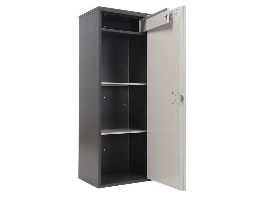 Представляет сварную конструкцию из стали, толщиной 1,2 мм. Оборудован встроенным отделением, запирающимся на ключ. Дверь имеет закрытую внутреннюю панель. Комплектуется двумя полками и ключевым замком Практик. Поставляется в собранном виде.