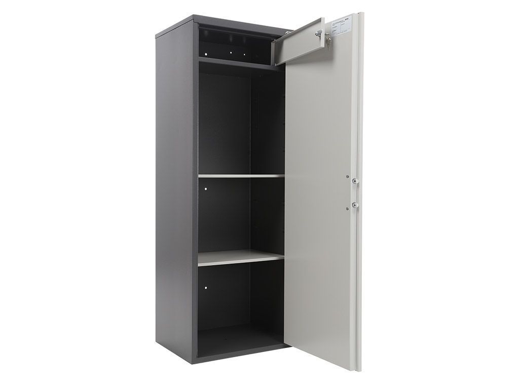 Представляет сварную конструкцию из стали, толщиной 1,2 мм. Оборудован встроенным отделением, запирающимся на ключ. Комплектуется двумя полками и электронным замком PLS-1. Поставляется в собранном виде.