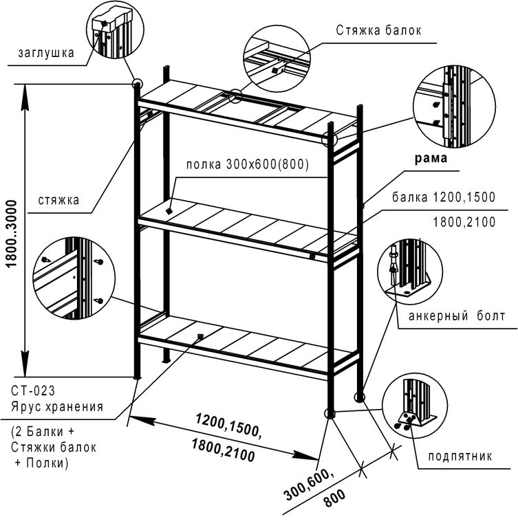 - Высота стеллажа: 1800/2000/2200/2500/2700/3000 мм