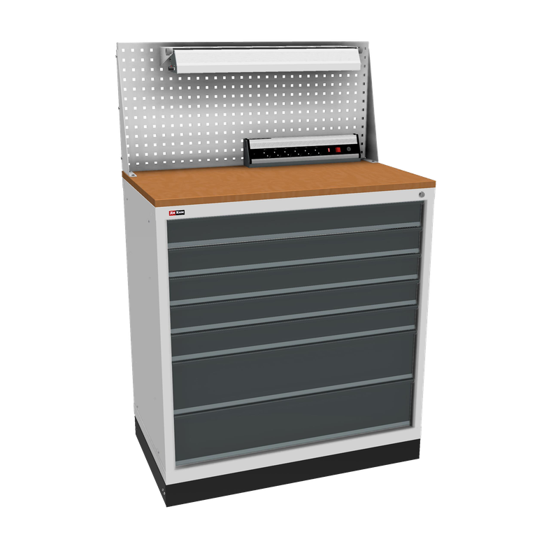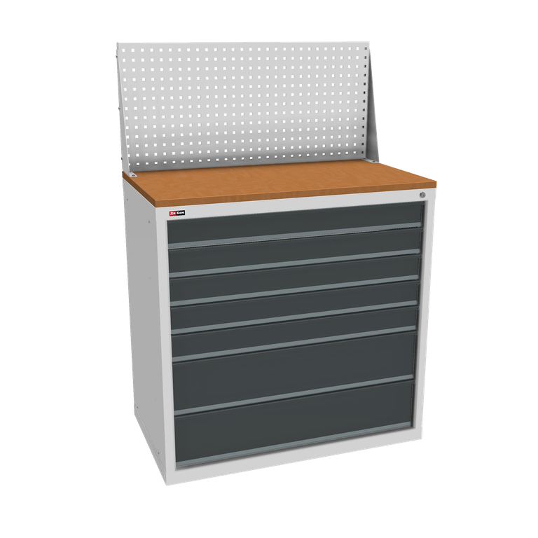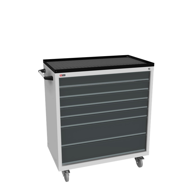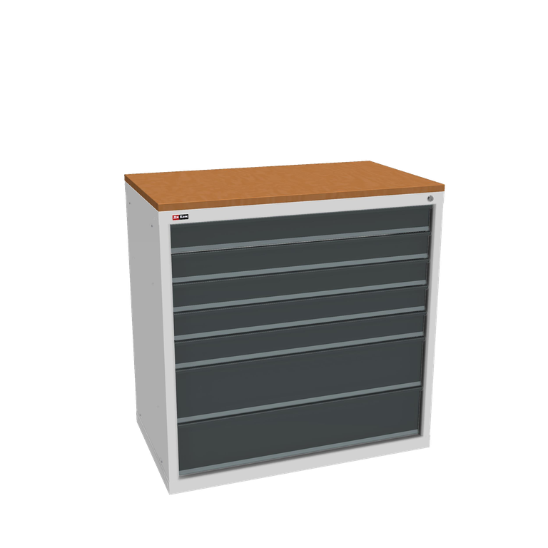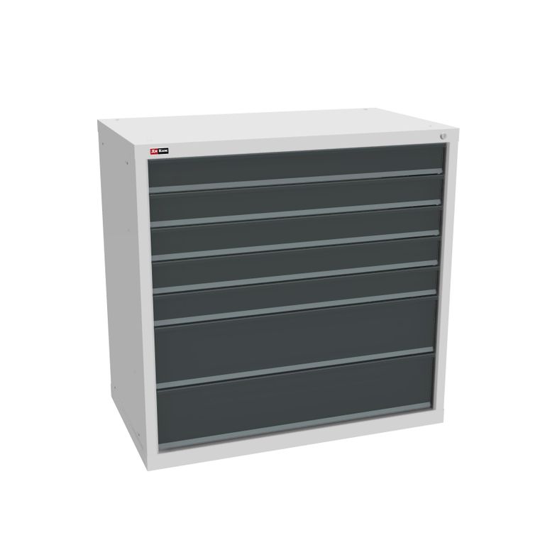 Изготовлена из металла, сварная, имеет 7 выдвижных ящиков (100х918х459 мм - 5 шт и 200х918х459 мм - 2 шт).