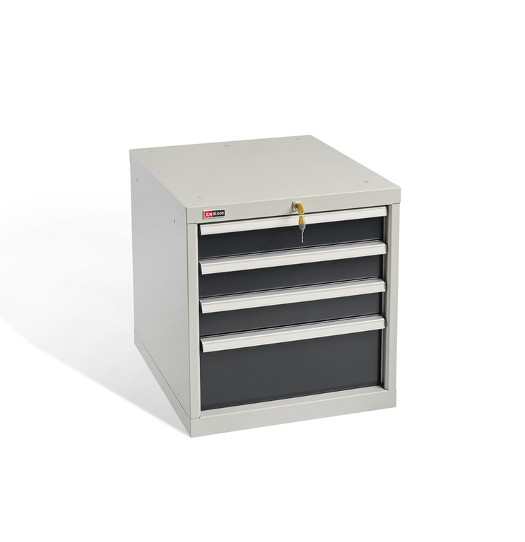 Четыре выдвижных ящика тумбы (100х459х459 мм) - 3 шт. и (200х459х459 мм) - 1 шт. оснащены общим центральным замком EURO-LOCKS (Германия, 2000 комбинаций) и системой антиопрокидывания: в целях безопасности два ящика одновременно выдвинуть невозможно. Максимальная нагрузка на ящик - 100 кг. При установке дополнительного комплекта направляющих максимальная нагрузка на ящик составляет 200 кг. Это возможно только для ящиков с высотой 150 мм и выше. Выдвижение ящиков: 98%. Тип направляющих: телескопические. Ручки ящиков сделаны из алюминиевого профиля и могут быть оснащены системами боковой блокировки и именной идентификации. В ящики можно дополнительно приобрести пластиковые лотки для ящиков: кубические или цилиндрические. Вместимость ящиков: Комплект лотков-01.