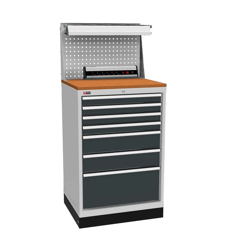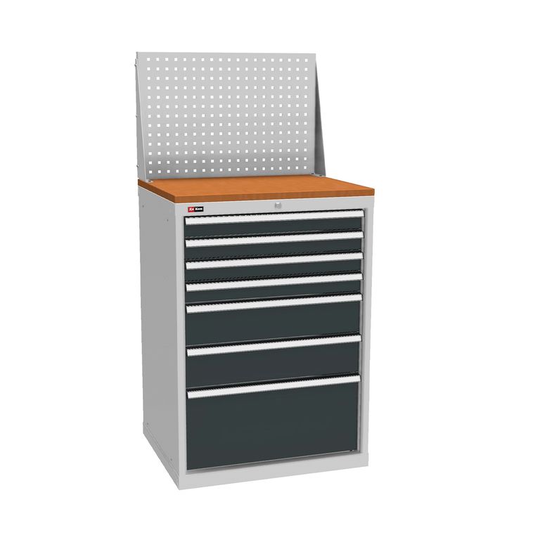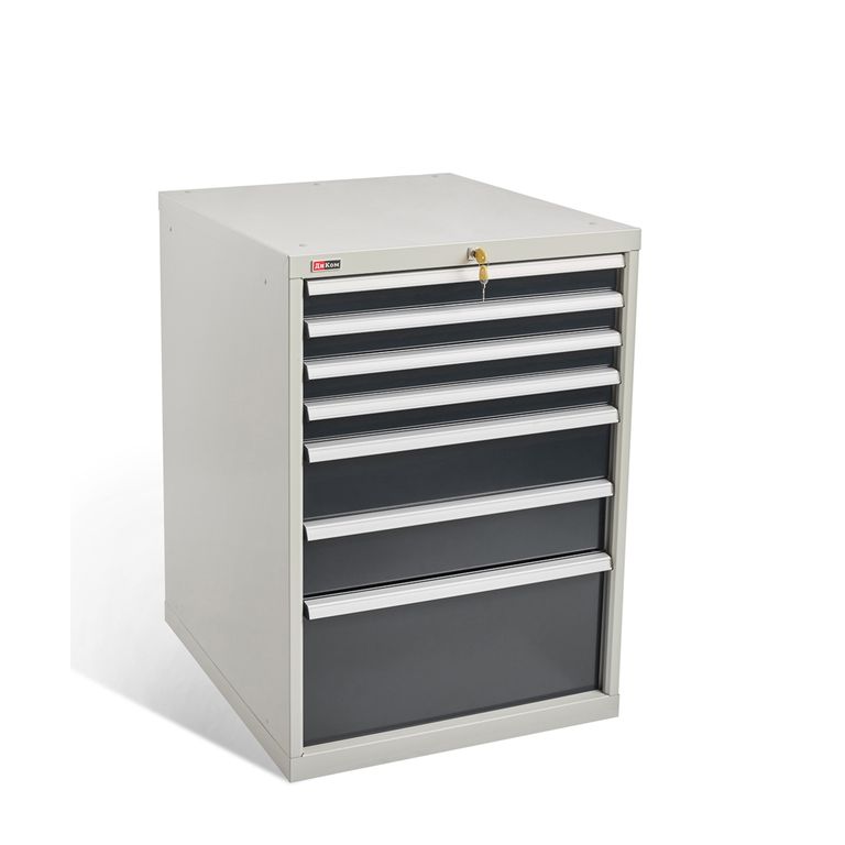 Семь выдвижных ящиков тумбы (75х612х612 мм) - 4 шт, (150х612х612 мм) - 2 шт и (300х612х612 мм) - 1 шт оснащены общим центральным замком EURO-LOCKS (Германия, 2000 комбинаций) и системой антиопрокидывания: в целях безопасности два ящика одновременно выдвинуть невозможно . Максимальная нагрузка на ящик - 100 кг. При установке дополнительного комплекта направляющих максимальная нагрузка на ящик составляет - 200 кг. Это возможно только для ящиков с высотой 150 мм и выше.