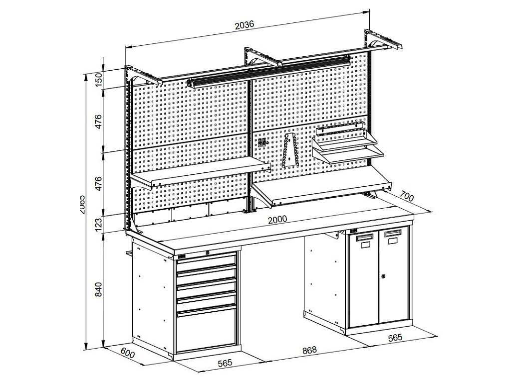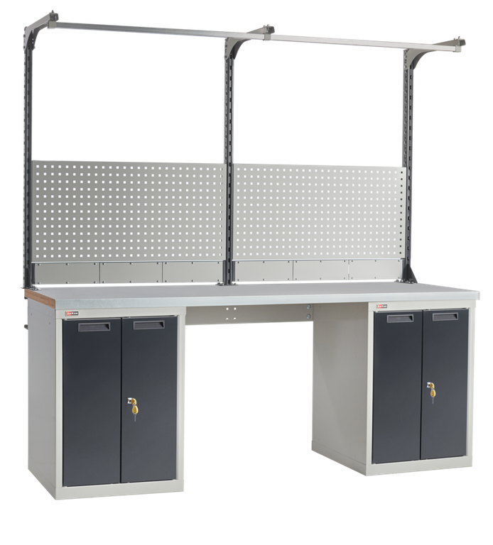 Металлические элементы верстаков окрашены эпоксидной порошковой краской, устойчивой к механическим воздействиям и агрессивным жидкостям. Ящики, дверцы тумб и стойки экрана – цвет темно-синий RAL 250 20 20, остальные элементы – цвет серый RAL 7038.