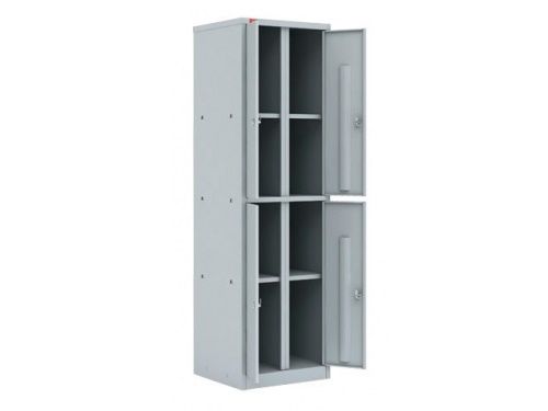 Шкаф двухсекционный, с 4 отделениями, изготовлен из металла.