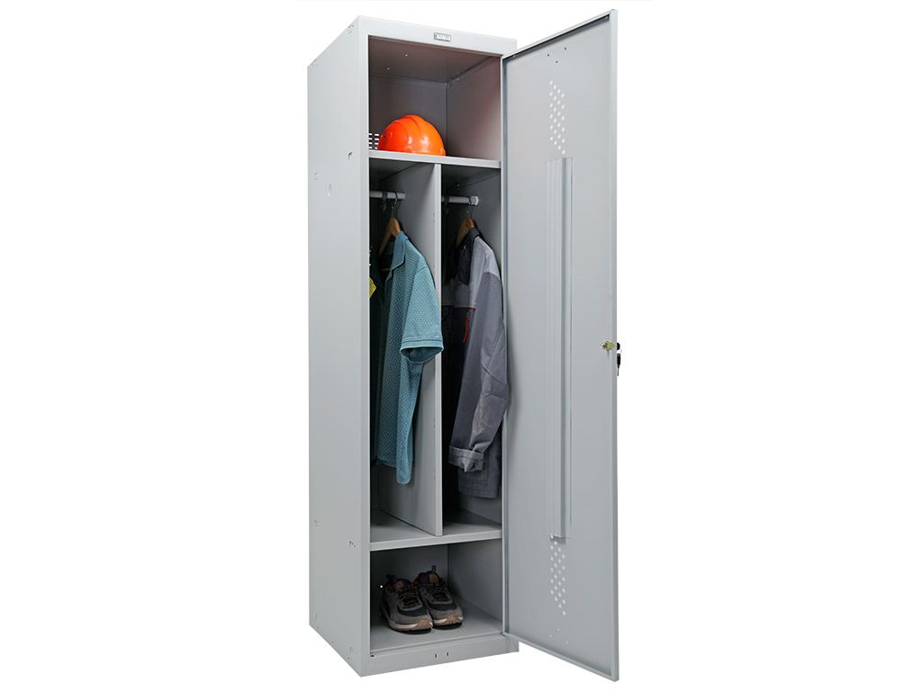 Укомплектован полкой для головных уборов, перекладиной, крючками для одежды, оборудован вентиляционными отверстиями в двери и задней стенке, в дверь устанавливается ключевой замок «Практик» (2000 комбинаций).