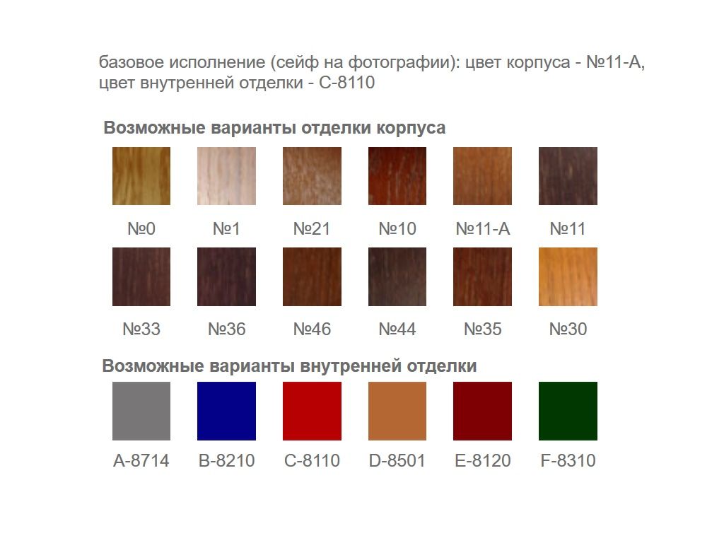 Внешняя отделка - натуральное дерево и шпон дуба (есть возможность тонировки по образцу мебели). Внутренняя отделка - бархат.
