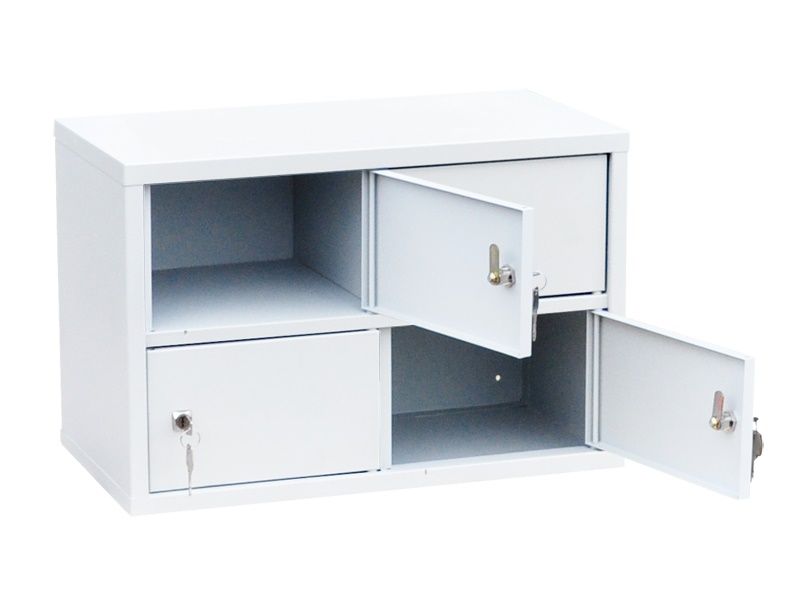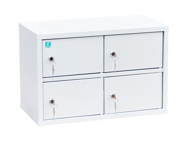 Изготовлен из металла, состоит из четырех отделений, четырех дверей. Каждое отделение комплектуется ключевым замком.