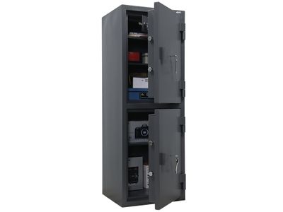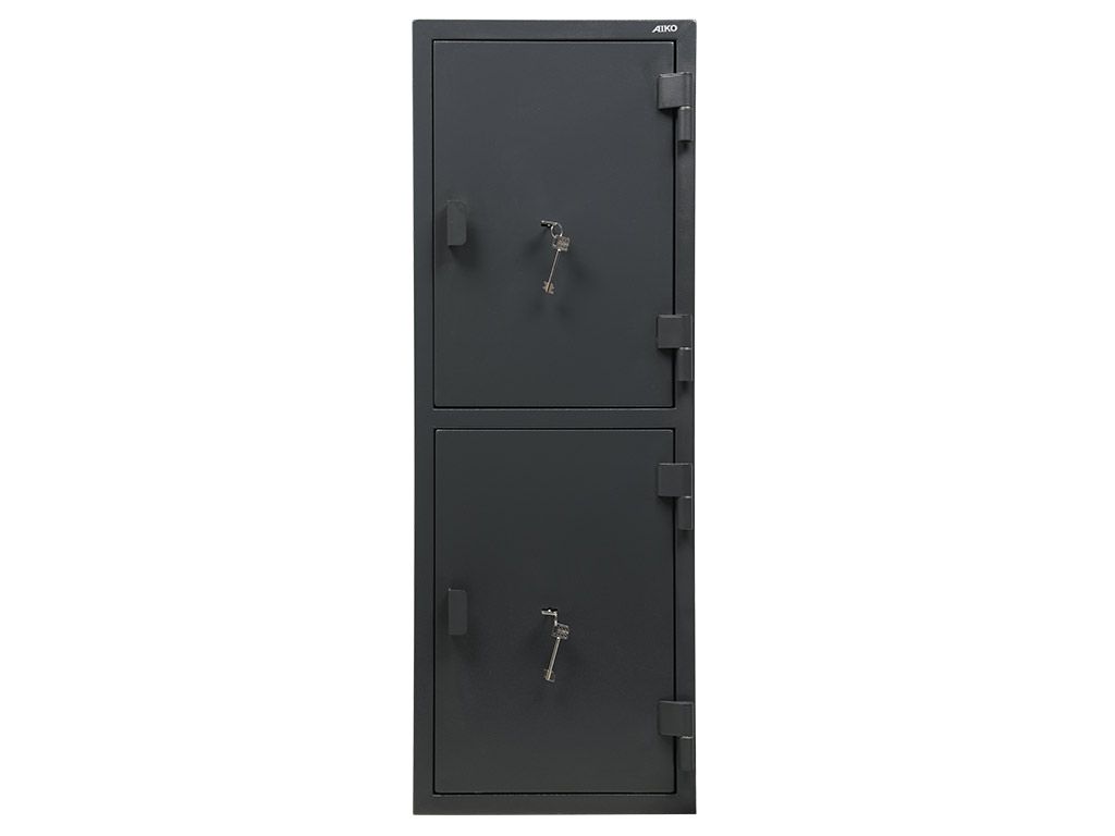 Сейф - двухсекционный, каждая секция оборудована полкой, закрывается на отдельную дверь и комплектуется ключевым замком BORDER. Система запирания - ригельная, диаметр ригеля - 26 мм.