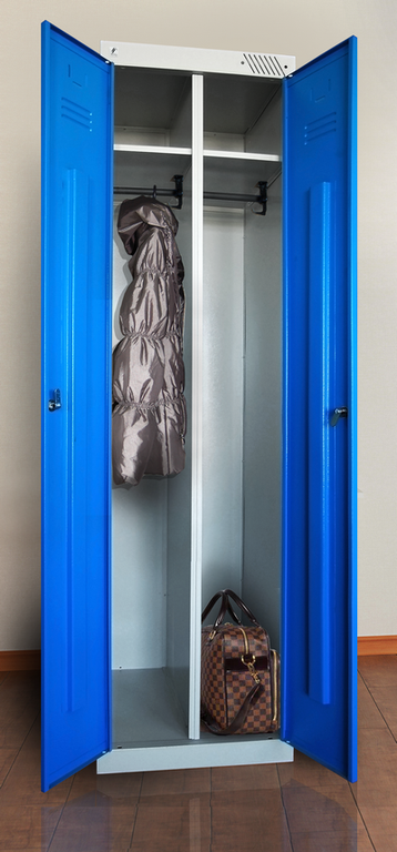 В каждой секции полка для головных уборов, по 2 крючка для одежды, перекладина для плечиков, индивидуальные замки. Нагрузка на полку не более 25 кг.