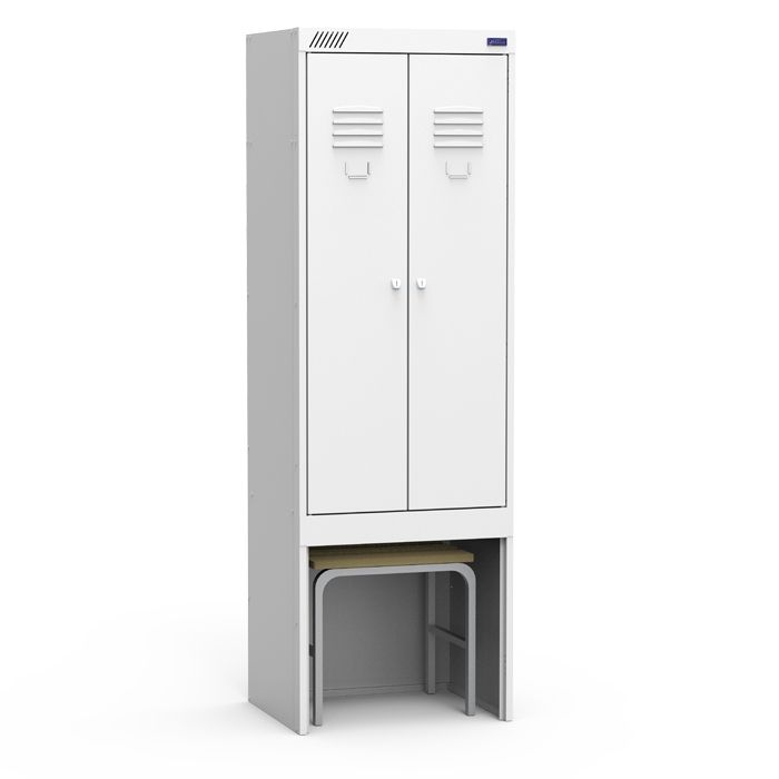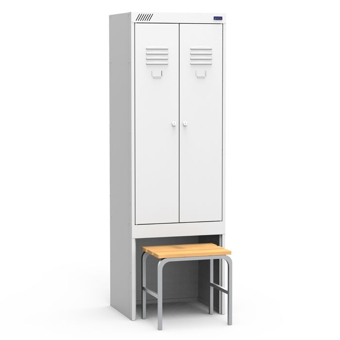Шкаф имеет две секции, две распашные двери и нишу под выдвижную скамью. Скамья в стоимость не входит, заказывается дополнительно. Комплектуется полками для головных уборов, крючками для одежды, перекладинами для "плечиков", двумя замками повышенной секретности. Дверцы шкафов оснащены вентиляционными отверстиями и местом под номерок. Дополнительно к шкафу можно заказать наклонную крышу, петли под навесной замок, ригельный замок, замок с мастер ключом (приобретается отдельно).