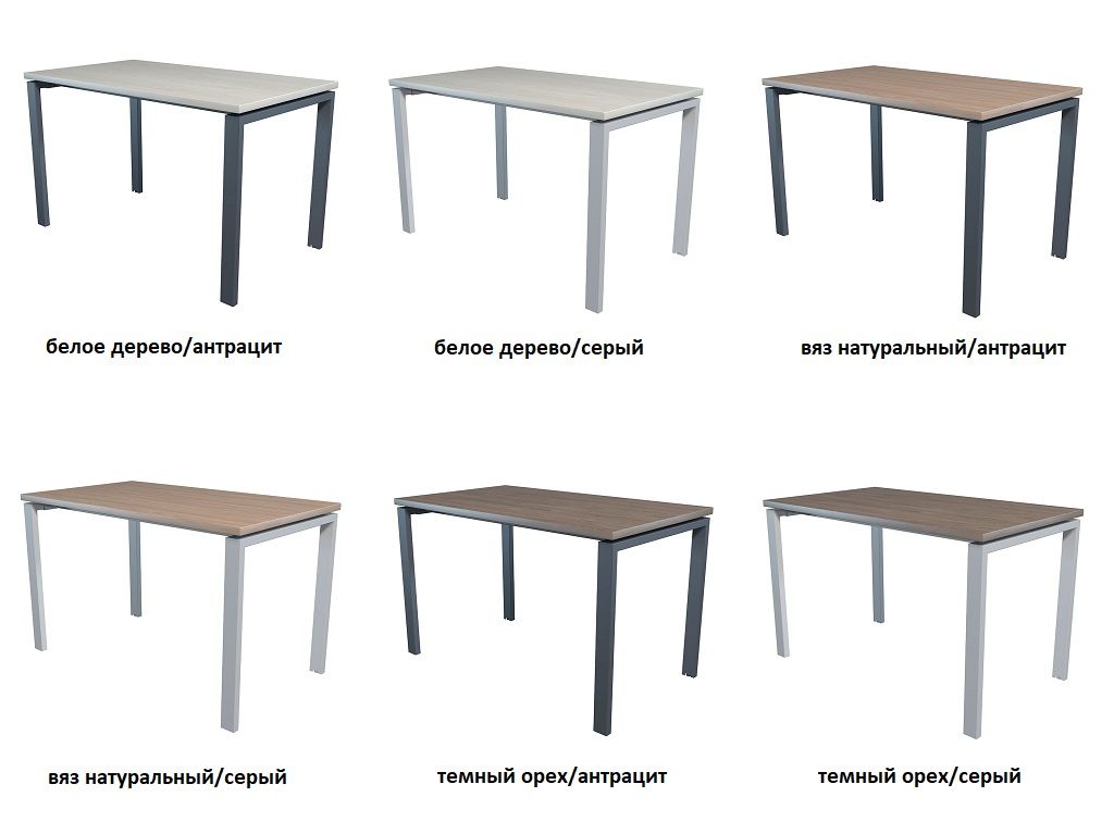 Состоит из столешницы, двух металлических П-образных опор и двух металлических траверс.