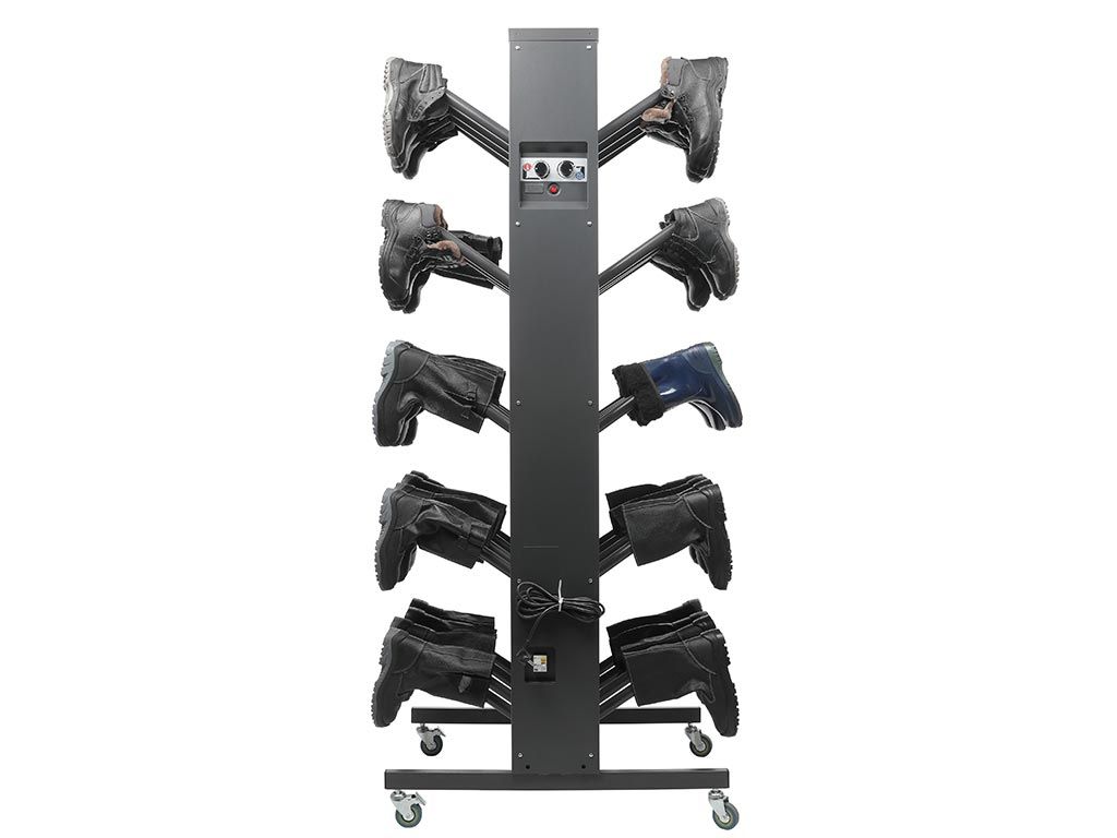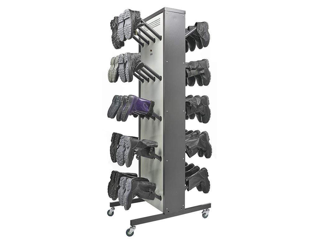 Обувь навешивается на стойки-кронштейны, через которые подается теплый воздух.