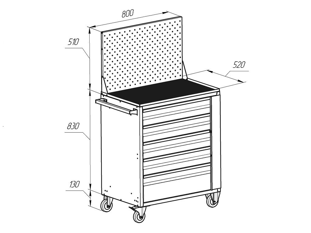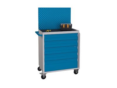 Изготовлена из металла, имеет пять выдвижных ящиков, экран для установки навесных элементов, боковую ручку.